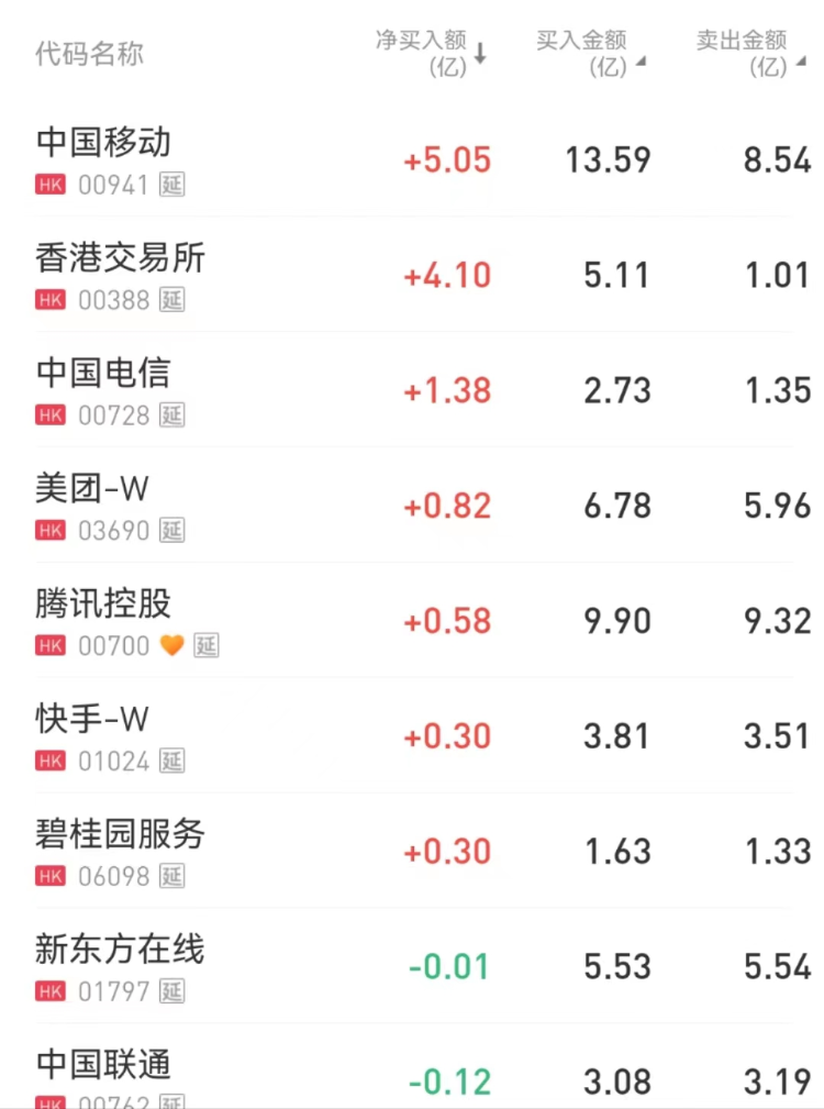 南下资金净买入中国移动5.05亿港元、香港交易所和中国电信分别获净买入4.1亿港元、1.38亿港元;注:南下资金已连续8日净买入中国移动,累计约25.1663亿港元。