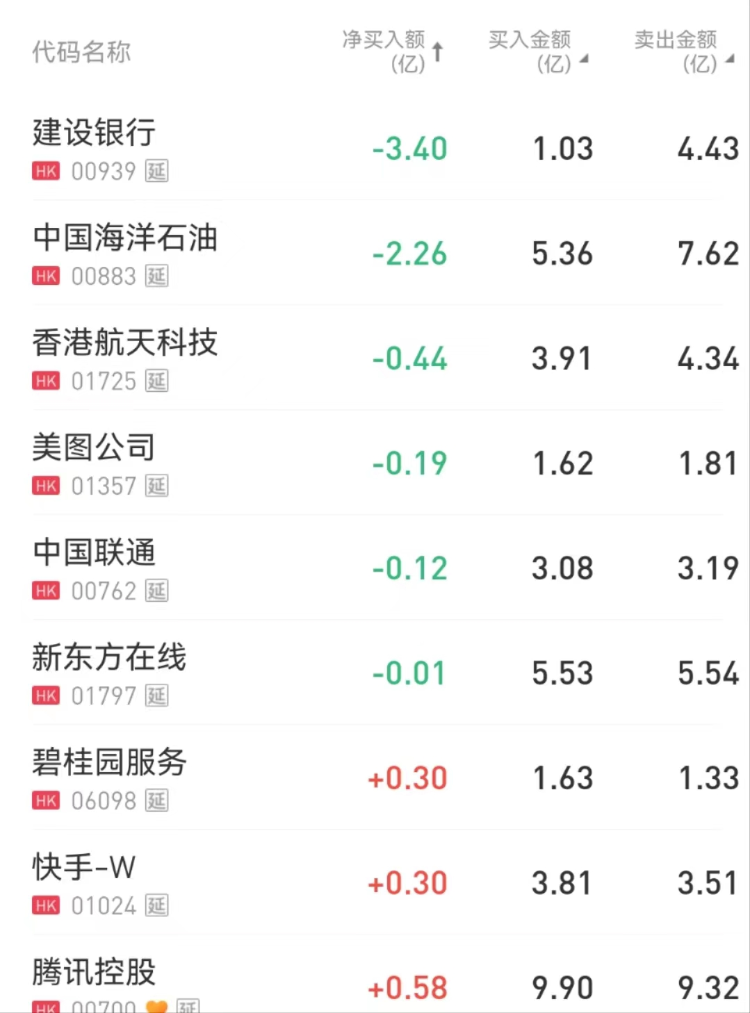 建设银行净卖出额居首,金额为3.4亿港元,中国海洋石油遭净卖出2.26亿港元,香港航天科技遭净卖出0.44亿港元。