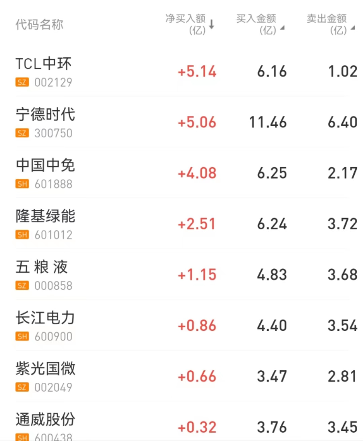 北向资金今日净买入0.76亿元。TCL中环、宁德时代、中国中免分别获净买入5.14亿元、5.06亿元、4.08亿元。招商银行净卖出额居首,金额为5.84亿元。
