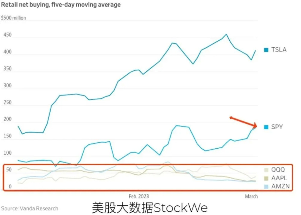 再往后数的QQQ指数、苹果和亚马逊,相关的散户单日净购买量更是只有特斯拉的约十分之一!