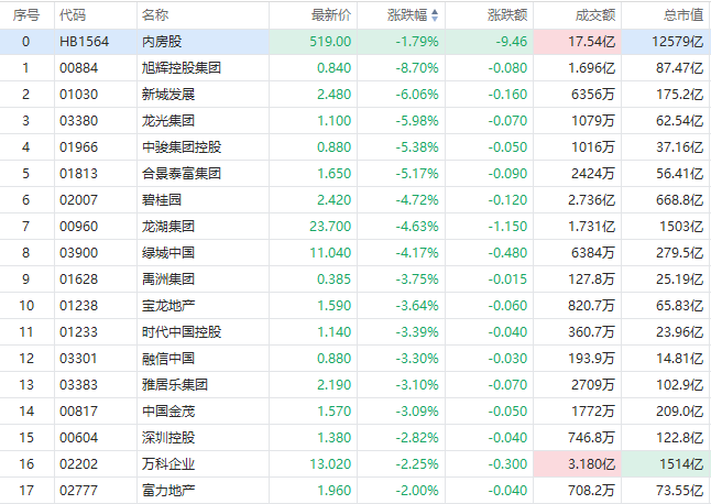 3月7日,内房股午后跌幅扩大,截至发稿,旭辉控股集团跌8.7%报0.84港元每股,新城发展跌6.06%,龙光集团、合景富泰集团跌超5%;碧桂园、龙湖跌逾4%,万科企业、富力地产跟跌。