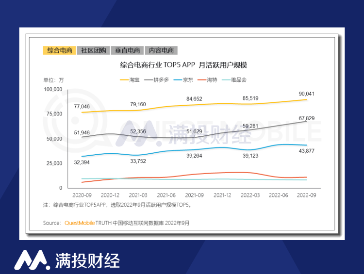 那怎么来提升GMV呢?两个方法,一个是提高用户数量,或是提高用户下单价格。但通常来讲,提高客单价都是一个比较危险的行为。不论是直接提高商品价格,或者是提高下单价格门槛,都有可能会损失一批对价格敏感的用户,此时就容易有外部竞争趁虚而入。而提高用户数量,对京东来说是一个更好的选择。据机构Quest mobile发布的《2022中国移动互联网发展年鉴》数据显示,2022年9月,京东的活跃用户数量约为4.39亿人,与同期的拼多多、淘宝相比,分别相差近2.39、4.61亿人,月活量仅为淘宝的一半,还有广阔的发展空间。因此如果京东能通过百亿补贴吸引到下沉市场的眼球,补全京东在下沉市场的用户画像,那将会给京东带来巨大的用户增量。