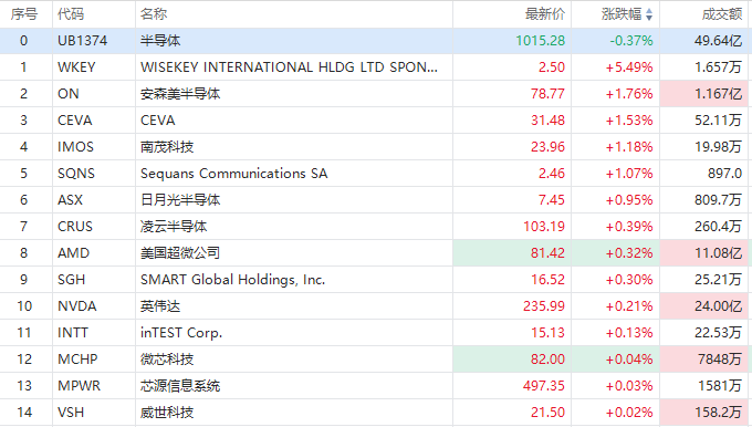 半导体板块震荡走高,WKEY涨超5%,安森美半导体,南茂科技涨超1%,日月光半导体,英伟达,美国超微公司跟涨。