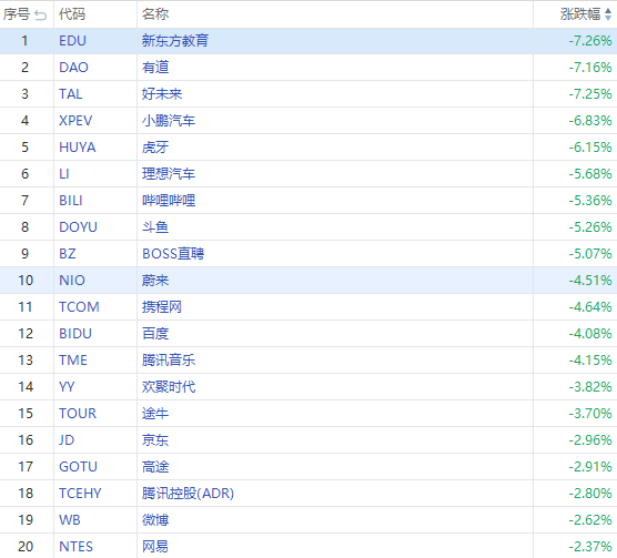 截至发稿,中概造车新势力普跌,小鹏汽车跌超6%,理想汽车跌超5%,蔚来跌超4%;中概教育股集体走跌,有道、新东方教育、好未来跌超7%。