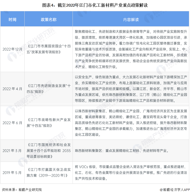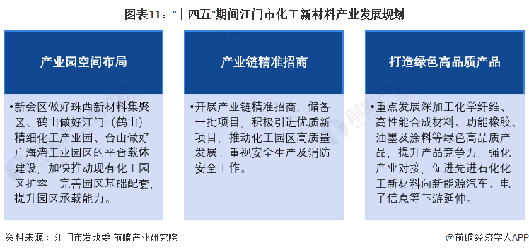 《江门市战略性新兴产业发展“十四五”规划》中提出,促进先进石化化工新材料高品质发展。打造高品质绿色先进石化化工新材料产业链。深入推进控链,提升珠西新材料聚集区、鹤山精细化工产业园的承载能力,加速推进台山广海湾经济开发区专业化工园区建设,鼓励和推动石化企业搬迁入园或就地改造,加快石化产品生产工艺升级改造,实现绿色智能化生产。