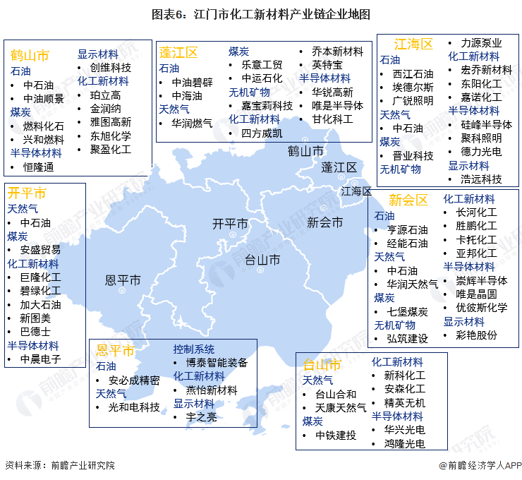 从产业链各环节的代表性企业分布地图来看,鹤山市、蓬江区、江海区、新会区的产业链最完善,鹤山市的化工材料发展竞争力较好,有著名企业创维显示,东旭化学等。各地区化工新材料企业聚集程度高,为下游显示材料、半导体材料等合成提供了有力的供应支持。