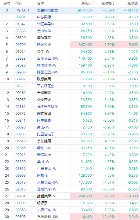 恒科成分股尽数下挫,科网股普跌,京东集团、网易、小米集团、美团跌超4%,阿里巴巴跌超3%,哔哩哔哩、百度集团、快手、腾讯控股跌逾2%。