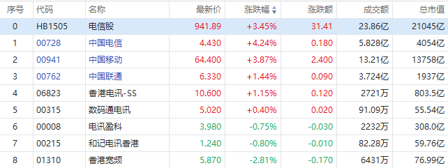 3月9日消息,三大运营商午后发力走强,中国电信涨4.24%报4.43港元每股,成交额5.828港元;中国移动涨3.87%,报64.4港元每股,中国联通由跌转升1.44%,香港电讯-SS涨超1%,电讯盈科微跌,香港宽频跌2.81%。