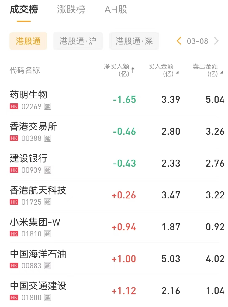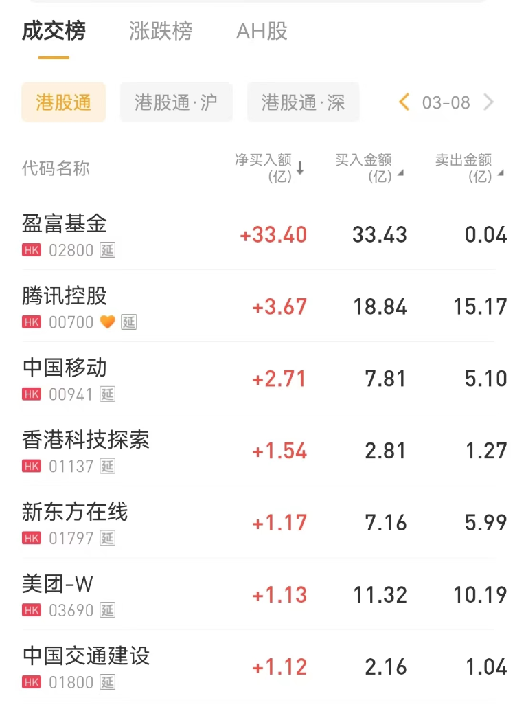 南下资金今日净买入港股75.55亿港元。盈富基金,腾讯控股、中国移动分别获净买入33.4亿港元、3.67亿港元、2.71亿港元;药明生物净卖出额居首,金额为1.65亿港元。
