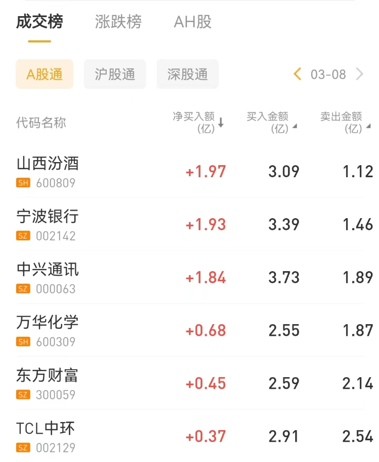 北向资金今日净卖出10.14亿元。山西汾酒,宁波银行,中兴通讯分别获净买入1.97亿元、1.93亿元、1.84亿元。贵州茅台净卖出额居首,金额为5.59亿元。
