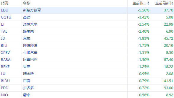 热门中概股美股盘前走低,新东方教育跌超5%,高途跌超3%,理想汽车、好未来跌超2%,京东、哔哩哔哩、小鹏汽车、阿里巴巴跌超1%。尚乘数科逆势涨超20%。