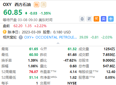 西方石油 $OXY 盘前涨2.22%,报62.2美元。根据SEC3月7日公布的文件,“股神”巴菲特旗下的伯克希尔哈撒韦公司近日加仓西方石油买入了近600万股,持股比例达到约21.6%。值得注意的是,这是伯克希尔时隔5个月后再次对西方石油进行加仓。