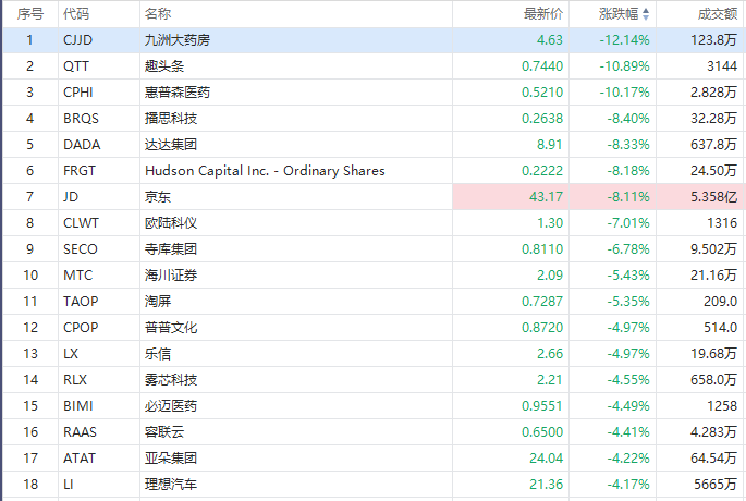 热门中概股普跌,京东Q4业绩不及市场预期,跌超8%,达达集团跌超8%,拼多多,哔哩哔哩,百度跌超3%,携程,贝壳,唯品会跌超2%,阿里巴巴跌超1%。