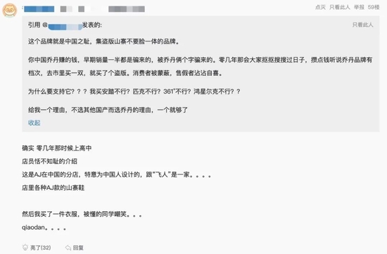 虽然乔丹体育在当时赢了官司,但消费者内心自有评判。有虎扑网友发帖表示:“叫乔丹,用乔丹剪影当logo,以前在店里还放各种乔丹的视频。不就是想给人一种是美国乔丹的印象吗。想想都知道,还洗什么?”乔丹体育也一时间成为了被群嘲的对象。