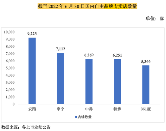 但值得注意的是,中乔体育对线下门店大力铺陈,截至2022年6月30日,乔丹品牌专卖店为6269家,在已上市的国内自主运动服饰品牌中排第三位,仅次于安踏和李宁,与特步不相上下。
