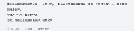 在虎扑论坛中,也有网友发帖称“中乔最近曝光越来越多了啊,一个是飞影pb,好多跑步的朋友给我推荐,还有一个是毒牙pro,最近能刷到好多测评。”