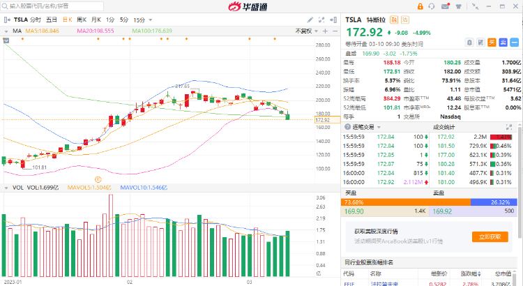 特斯拉股价周四下跌近5%,连续第四个交易日下跌,收于172.92美元,创2月1日以来最低。凯茜·伍德的方舟投资管理公司此前再度出手,买入69329股,按收盘价计算价值逾1260万美元。