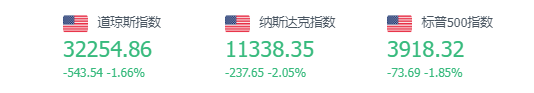 美股周四大幅收跌,银行股与科技股领跌。道指跌幅为1.66%,报32254.86点;纳指跌幅为2.05%,报11338.35点;标普500指数幅为1.85%,报3918.32点。特斯拉收跌4.99%,硅谷银行暴跌60%,京东跌11.28%。