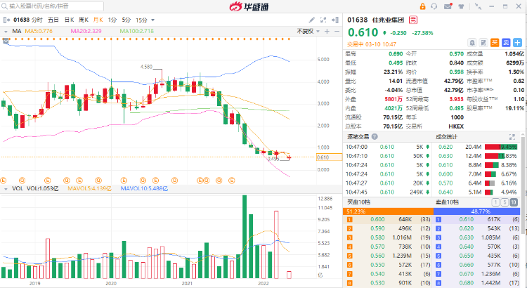 今日(3月10日)开盘后,佳兆业集团股价一度跌40%。截至发稿,佳兆业集团股价跌27%,市值为42.79亿港元,市值较复牌前跌去超10亿港元。
