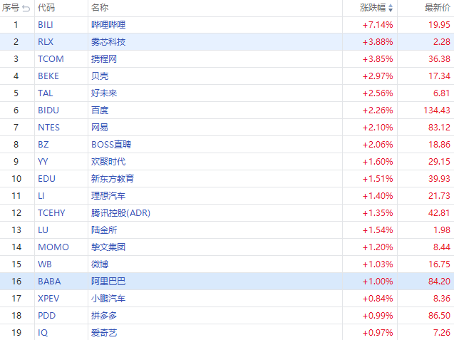 热门中概股走势分化,雾芯科技绩后涨超5%,哔哩哔哩涨超7%,携程网涨超4%,贝壳涨超2%,唯品会,百度涨超1%,拼多多,阿里巴巴小幅翻红,晶科能源绩后股价跌超15%,满帮跌超3%,京东跌超2%,台积电跌近1%。