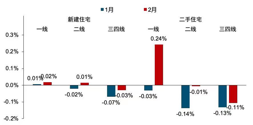 2023年1月-2月各梯队城市新建及二手住宅价格环比涨跌变化。来源:中指研究院