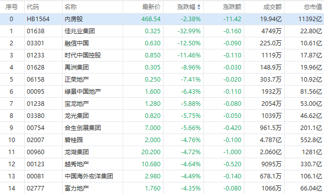 当日开盘后,佳兆业集团一度跌超40%,随后跌幅不断收窄。3月14日,佳兆业再度领跌内房股。截至发稿跌32.99%报0.325港元每股;融信中国跌12.5%,时代中国控股跌超11%,龙光集团跌超5%,碧桂园跌4.76%报2港元每股,成交额4.787亿港元;龙湖集团、越秀地产、富力地产跌逾4%
