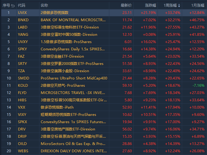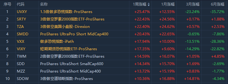投资者还需继续关注恐慌指数ETF和做空股指ETF,其中3倍做空罗素2000指数ETF $SRTY 周涨超22%、2倍做空罗素2000ETF $TWM 周涨超14%、3倍做空道琼斯指数ETF $SDOW 周涨超10%。
