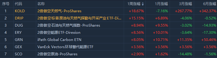 能源ETF方面,本周涨幅居前的为2倍做空天然气ETF $KOLD 周涨超18%、2倍做空标普原有与天然气探勘与开采产业ETF $DRIP 周涨超15%、2倍做空石油与天然气指数ETF $DUG 周涨近9%、2倍做空原油 $SCO 周涨近3%。