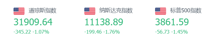 道琼斯指数上周跌4.44%,报31909.64点;纳斯达克指数上周跌4.71%,报11138.89点;标普500上周跌4.55%,报3861.59点。截至上周五收盘,雾芯科技涨超15%,哔哩哔哩涨近6%;亚马逊收跌1.65%,苹果收跌1.39%,Meta Platforms跌1.2%。