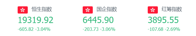 恒生指数上周跌6.07%,报19319.92点;国企指数上周跌7.11%,报6445.9点;恒生科技指数上周跌10.19%,报3782.22点;截至上周五收盘,科网股集体下跌,京东 $09618.HK 跌超11%,百度 $09888.HK 跌近6%,快手 $01024.HK 跌超5%;汽车股重挫,比亚迪股份跌超8%。长城汽车跌超6%。