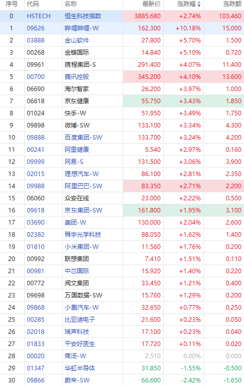 科网股集体走强,哔哩哔哩-W涨超10%,腾讯控股涨超4%,快手-W、百度集团-SW、网易-S涨超3%,阿里巴巴-SW、美团-W涨超2%。