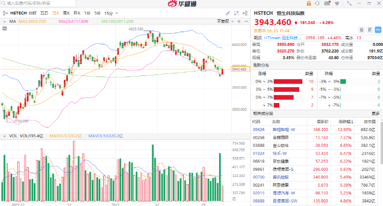 具体来看,科技股强势反弹。哔哩哔哩涨超12%,腾讯。快手涨超4%,阿里涨超3%。