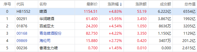 3月13日,啤酒股早盘涨幅居前,截至发稿,华润啤酒(00291)涨5.95%,报61.4港元;百威亚太(01876)涨4.54%,报24.2港元;青岛啤酒股份(00168)涨4.22%,报82.75港元。
