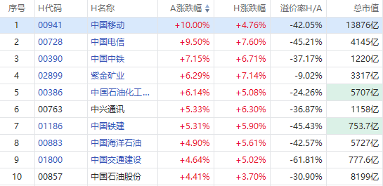 截至A股收盘,AH股涨幅前10如下: