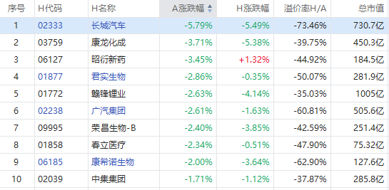 长城汽车A股跌5.79%,H股现跌5.49%,康龙化成A股跌3.71%,H股现跌5.38%,君实生物A股跌2.86%,H股现跌0.35%。