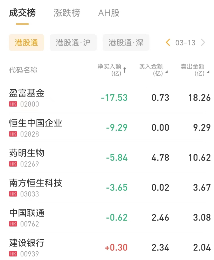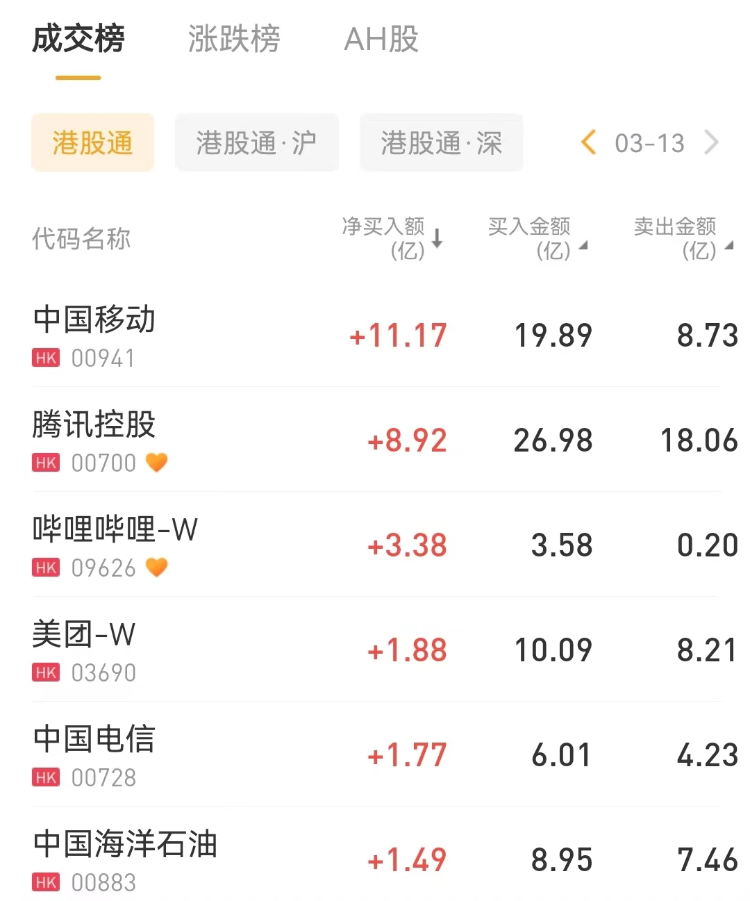 南下资金今日净买入港股3.44亿港元。中国移动,腾讯控股,哔哩哔哩分别获净买入11.17亿港元、8.92亿港元、3.38亿港元;盈富基金净卖出额居首,金额为17.53亿港元。