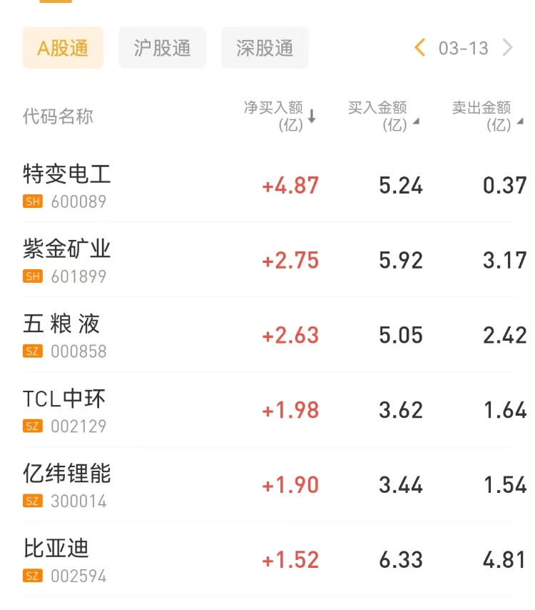 北向资金今日净买入27.7亿元。特变电工,紫金矿业,五粮液分别获净买入4.87亿元、2.75亿元、2.63亿元,浪潮信息净卖出额居首,金额为3.08亿元。