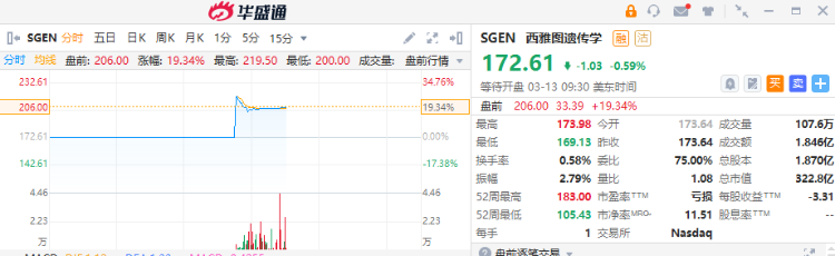 西雅图遗传学美股盘前涨近20%,据报道,辉瑞将以每股229美元现金的价格,按430亿美元的总企业价值收购西雅图遗传学。
