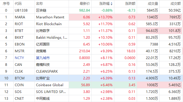 在强劲的虚拟货币价格推动下,区块链概念股集体大涨,截至发稿,Marathon Patent涨超13%,Riot Blockchain、比特数字涨超11%,亿邦国际涨超10%,Coinbase $COIN 涨超6%。