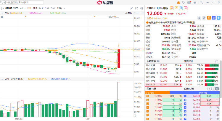 3月14日讯,首发解禁首日,叮当健康(09886)盘初急速拉升,一度触及20.20港元,创上市以来新高。日前,公司合计持股占比超49%的控股股东再度作出禁售承诺,将禁售期截止日延长至24年3月13日。截至发稿,叮当健康涨72.91%,报12港元,成交额0.27亿港元。