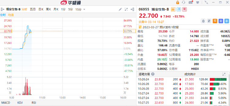 华盛资讯3月14日消息,博安生物-B(06955)早盘大幅反弹,盘中一度升约71%。截至发稿,该股涨53.79%,报22.47港元。本周开始,公司股份首次成为港股通投资标的。