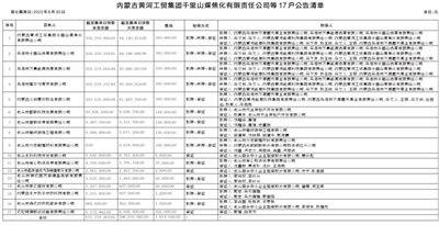 根据中信银行股份有限公司呼和浩特分行(简称“中信银行呼和浩特分行”)与中国华融资产管理股份有限公司内蒙古自治区分公司(简称“华融资产公司”)于2022年12月29日签署的《债权转让协议》的约定,中信银行呼和浩特分行将其对内蒙古黄河工贸集团千里山煤焦化有限责任公司等17户不良资产(详见下列公告清单)中所列债务人及其担保人享有的主债权及担保合同项下的全部权利依法转让给华融资产公司。中信银行呼和浩特分行与华融资产公司公告通知内蒙古黄河工贸集团千里山煤焦化有限责任公司等17户不良资产各债务人、担保人及其他义务人。