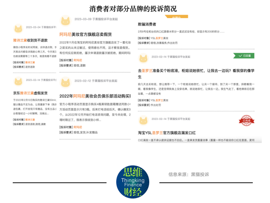 而除了上述国内品牌外,一些国际品牌也多次被投诉。包括宝洁(PG.US)旗下的玉兰油、雅诗兰黛(EL.US)、以及欧莱雅旗下的欧莱雅、兰蔻、圣罗兰YSL、赫莲娜HR、阿玛尼等品牌,投诉内容集中在虚假宣传、欺骗消费者、拒绝七天无理由退货、产品发霉有异物等。
