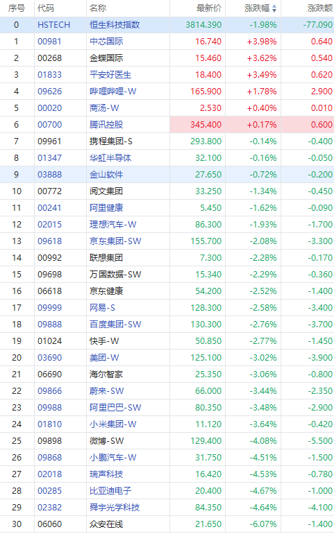 其他成分股方面,平安好医生、中芯国际、金蝶国际涨超3%;众安在线跌超6%,舜宇光学科技、瑞声科技跌超4%。