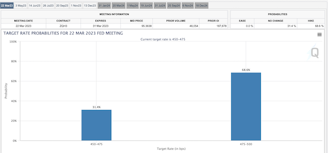 截至记者发稿,据利率观察工具(FedWatch Tool),3月22日美联储宣布不加息的概率陡升至31.4%,加息25个基点至4.75%~5.00%的概率为68.6%,交易员不再押注加息50个基点,要知道就在一天前,预期加息50个基点的概率高达40.2%。