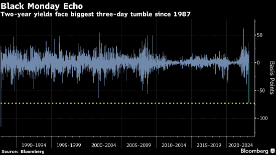 随着投资者纷纷湧入这个避险资产,2年期美债收益率出现1980年代以来的最大单日下跌,在之前的三个交易日下跌超过1个百分点。该收益率周二上涨11个基点至4.08%,为四天来首次上涨。