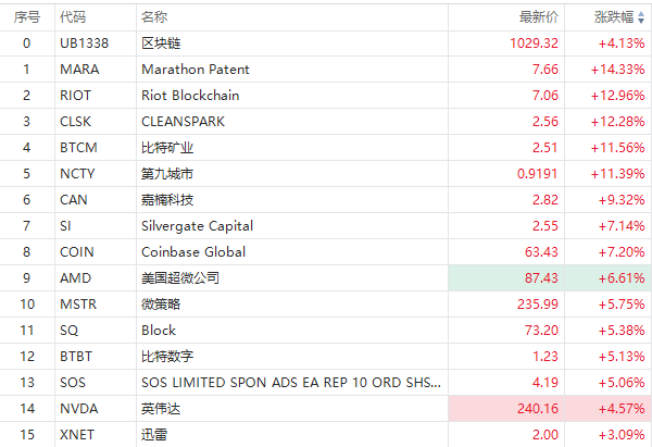 华盛资讯3月14日消息,美国2月CPI数据符合市场预期,三大指数高开高走,区块链概念股大幅走高,Marathon Patent涨超13%,比特矿业涨超12%,第九城市涨超11%,Coinbase Global涨超6%,Silvergate Capital涨超7%,嘉楠科技涨超8%,美国超微公司涨超6%,亿邦国际涨超1%。