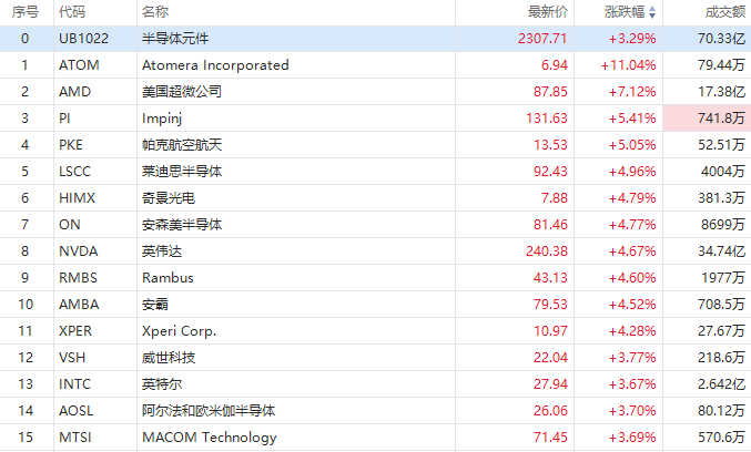 华盛资讯3月14日消息,美国2月CPI数据符合市场预期,三大指数高开高走,半导体板块大幅走高,美国超微公司涨超11%,Impinj涨超5%,帕克航空航天涨超5%,英伟达,奇景光电,安森美半导体,莱迪斯半导体,安霸涨超4%,英特尔涨超3%。