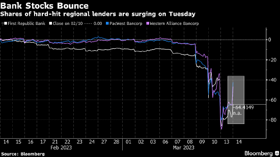 随着对金融体系的担忧缓解,美国地区性银行股周二上涨,收复了硅谷银行倒闭后的跌幅。