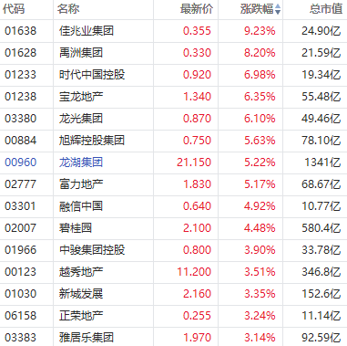 受消息驱动,内房股早盘集体走强,截至发稿,佳兆业集团涨超9%,时代中国控股、宝龙地产、龙光集团涨超6%,旭辉控股集团、龙湖集团、富力地产涨超5%,碧桂园涨超4%。